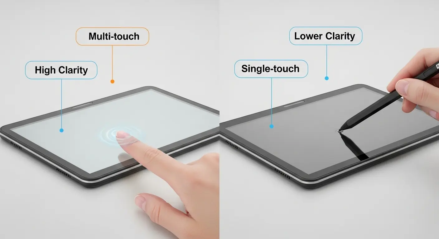 Comparing capacitive vs resistive touch screens reveals that capacitive tech is superior for modern handhelds due to its responsiveness. Resistive screens require physical pressure, leading to "false negatives" where a touch isn't registered. Capacitive screens react to the lightest touch, providing a much more intuitive and "premium" feel for the end-user.